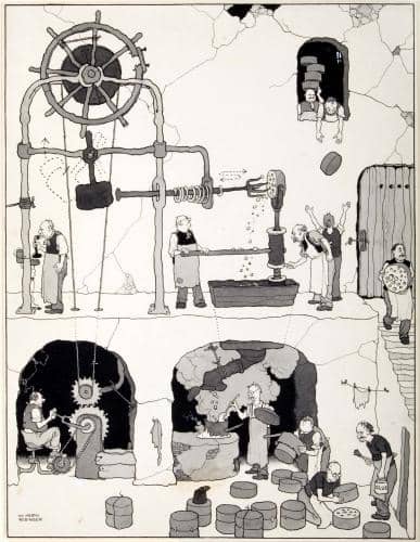 ​W. Heath Robinson was a British illustrator and cartoonist famed for his fantastically complicated contraptions designed to achieve simple tasks — so much so that “a Heath Robinson contraption” entered the language.
