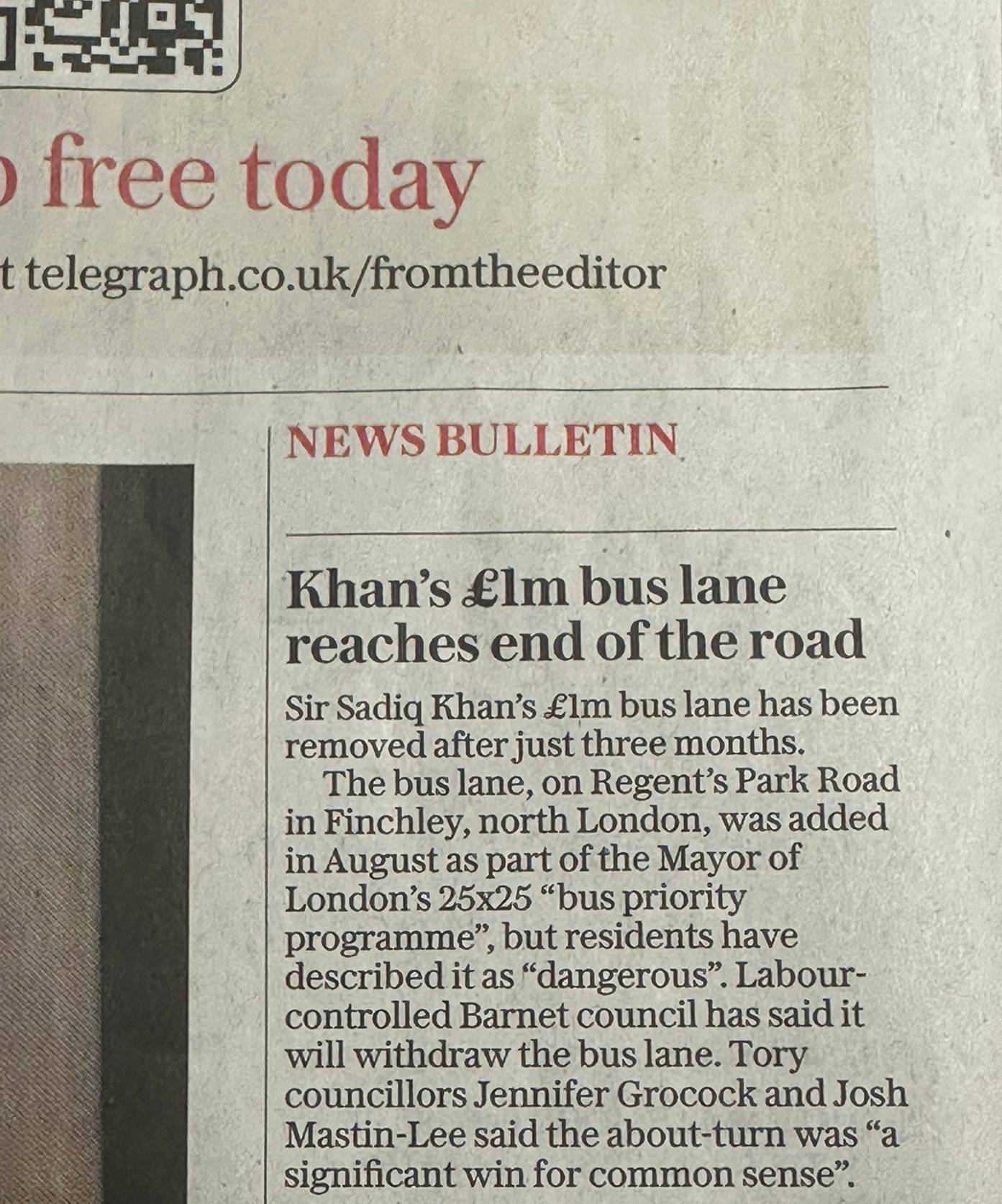 Finchley made the (inside) front page news of the Daily Telegraph (above) about the Bus Lane removal. Roadworks are underway to put everything back to how it was before. A triumph for the community voice.